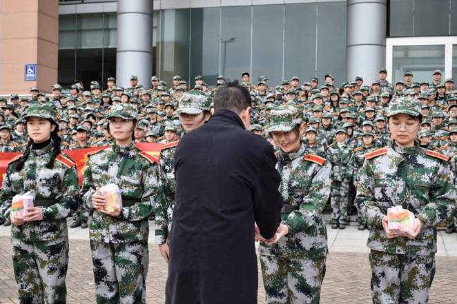 紧接着,余鹏翼院长、黎冬书记和杜焕君副书记代表学院为教官和学生送上暖宝贴等慰问品,院领导鼓励的话语和贴心的慰问给冬日里的军训带去了温暖。