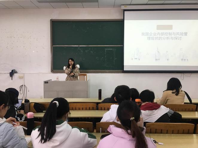 最后,钟子英老师就“我国企业内部控制与风险管理现状的分析与探讨”展开第三场讲座。钟老师围绕“什么是内部控制与风险管理”、“主要方法有哪些”、“我国企业典型内控漏洞表现及剖析”、“我国对企业内控建设的监管现状”四个方面进行讲解,让同学们对内控有一个基本认识,同时通过了解内控的主要方法如不相容职务分离来学习如何去识别、监督和控制风险。并且结合案例为同学们进行剖析。