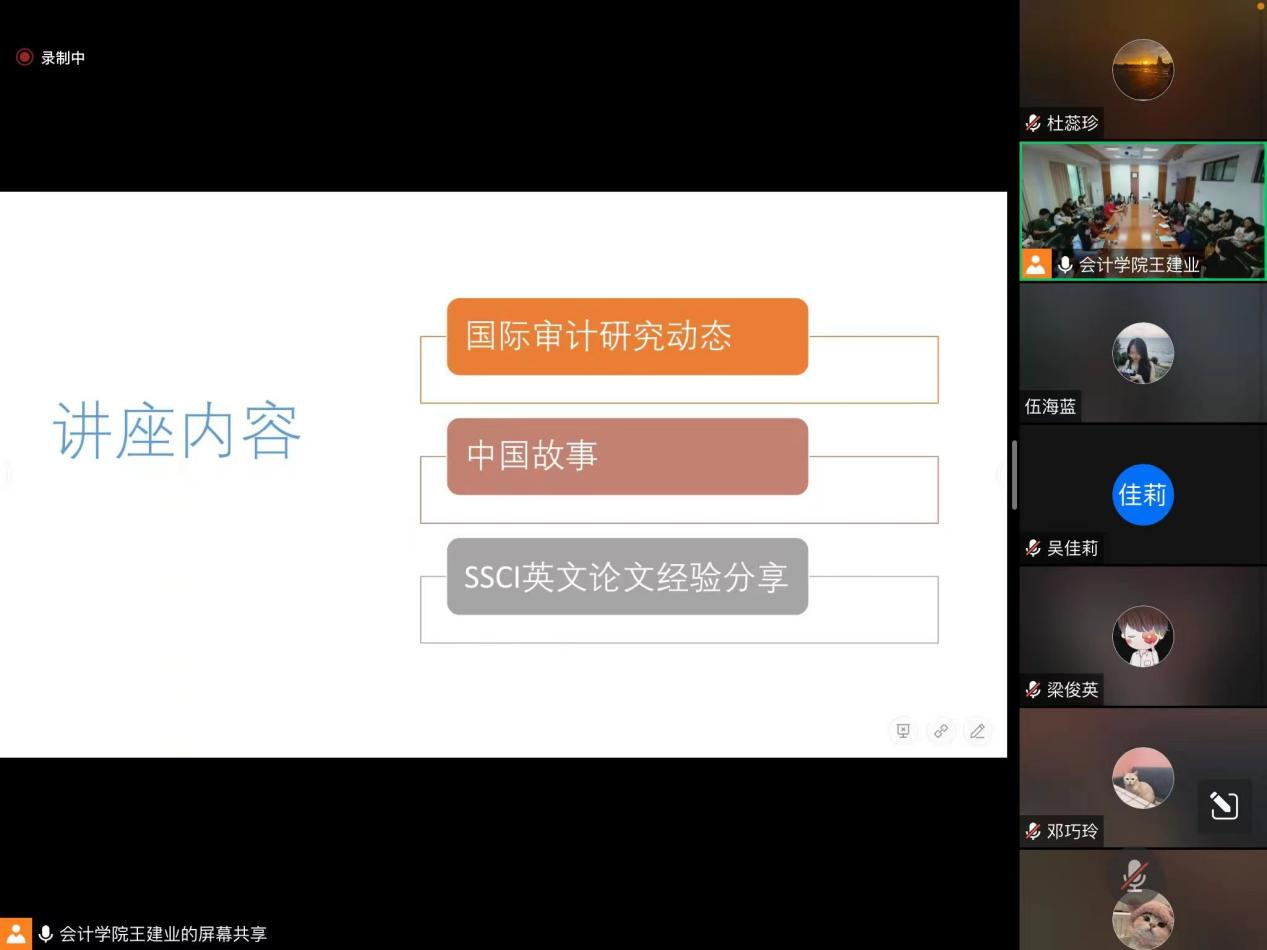 2023年6月25日下午,南京审计大学廖林副教授应邀参加美高梅mgm1888公司官网云山会计大讲堂,做了题为“基于中国场景的国际审计研究”的学术报告。此次讲座廖林副教授通过自身发表期刊的经历,对如何讲好中国审计故事提出了自己的见解,并且对目前国际审计研究的趋势进行了总结。讲座由美高梅mgm1888公司官网副院长龙文滨教授主持,线上线下师生共40余人参加。