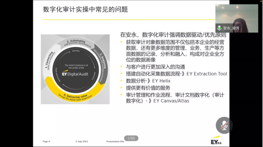 梁芳经理介绍了数字化审计的定义,让同学对数字化审计有初步了解。列举出数字化审计的工具,指出它们在数据的采集、转换、清理、验证,与在查询分析、多维分析、数据挖掘等方面的作用。通过案例介绍,她分析了实务中典型的数据问题,指出安永在数字化审计中强调数据驱动或优先原则,获取审计对象数据范围不仅包括本企业的经营数据,还有更多维度的管理、业务、生产等方面数据的记录、分析和融入,构成对企业全方位的数据画像,同时要与客户进行更加深入的沟通,提供更有价值的服务。