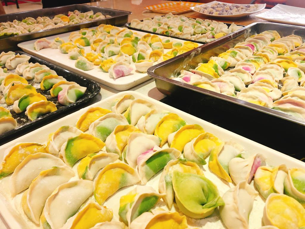 窗外寒冷,屋内暖意浓浓。活动在一片温馨的氛围中拉开序幕,大家分成若干组,和面、切菜、拌馅、擀皮,忙的不亦乐乎。为照顾到大家口味,老师们调制彩色面皮及不同味道的饺子馅。
